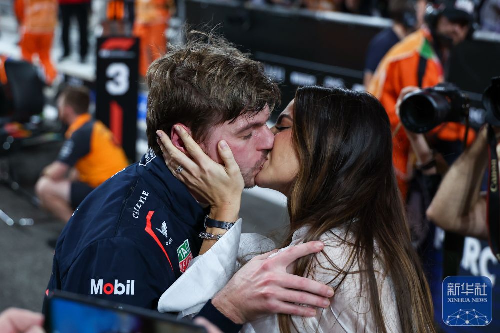 ↑ 红牛车队荷兰车手维斯塔潘赛后与女友凯利·皮奎特亲吻。新华社发(李超摄)