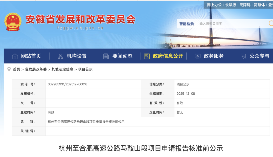 现将杭州至合肥高速公路马鞍山段项目申请报告核准内容予以公示。公示时间自公示之日起5个工作日(12月8日—12月12日),如有意见和建议,请向省发展改革委基础设施发展处反映。反映以来人或署名来信(包括电子信函)方式,并提供姓名及联系电话,对匿名方式提出异议的不予受理。