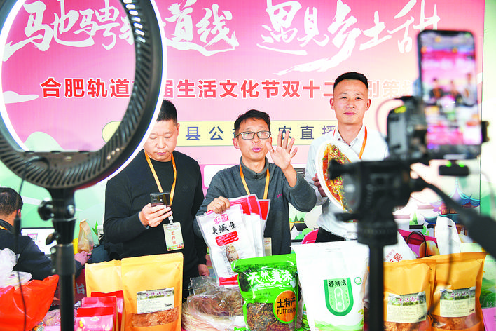 12月12日,合肥市轨道交通集团有限公司联合安徽肥东县、肥西县、长丰县、庐江县等四县,在合肥南站地铁站开展合肥轨道首届生活文化节公益助农活动。长丰草莓、肥西黄豆粉折、肥东杭椒、庐江金牛大扁糖等农特产品现场热卖。肥东“岭上书记行”、庐江“书记四人寻”等四县公益助农直播同步开启,线上、线下人气满满。图为“书记四人寻”直播助农团队推介本地农特产品。