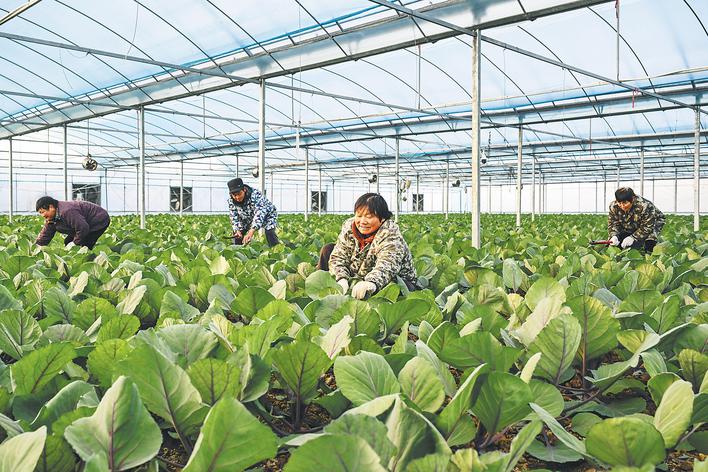 12月14日,在庐阳区三十岗乡崔岗村安徽东华农业科技开发股份有限公司智慧农业蔬菜种植基地,农民正在采用智能温室大棚、智能肥水控制系统管护蔬菜。