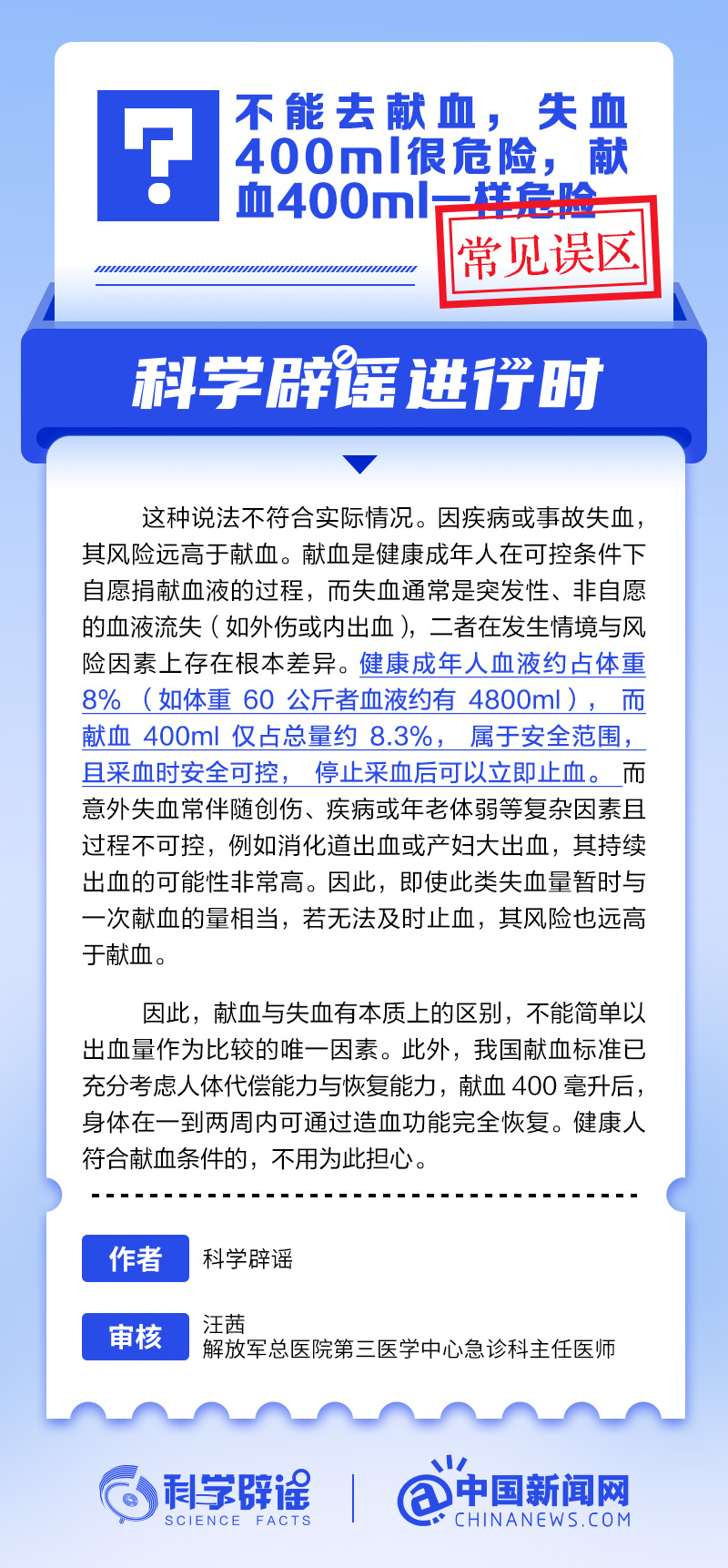 中新网12月18日电 献血与意外失血有本质上的区别,不能简单以出血量作为比较的唯一因素。因疾病或事故失血,其风险远高于献血。献血是健康成年人在可控条件下自愿捐献血液的过程,而意外失血通常是突发性、非自愿的血液流失(如外伤或内出血),二者在发生情境与风险因素上存在根本差异。意外失血常伴随创伤、疾病或年老体弱等复杂因素且过程不可控,例如消化道出血或产妇大出血,持续出血的可能性非常高。(来源:@科学辟谣 中国新闻网微博)