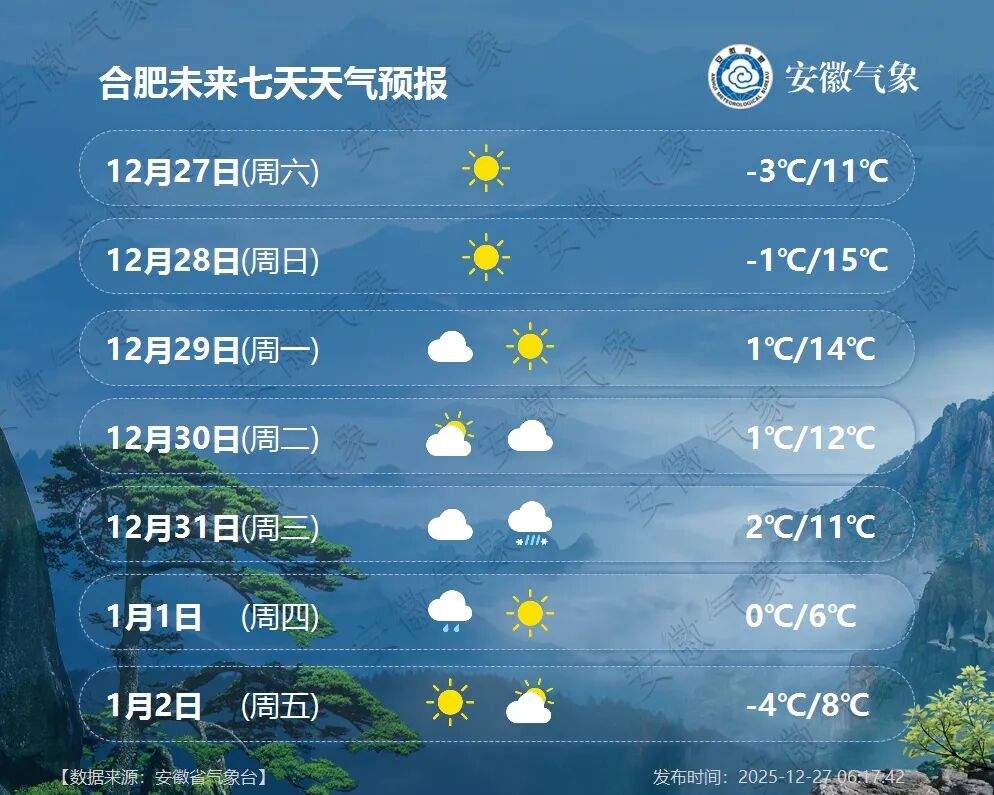 昨天全省晴天到多云;今天早晨合肥以南最低气温-4~-2℃,合肥以北-2~1℃。