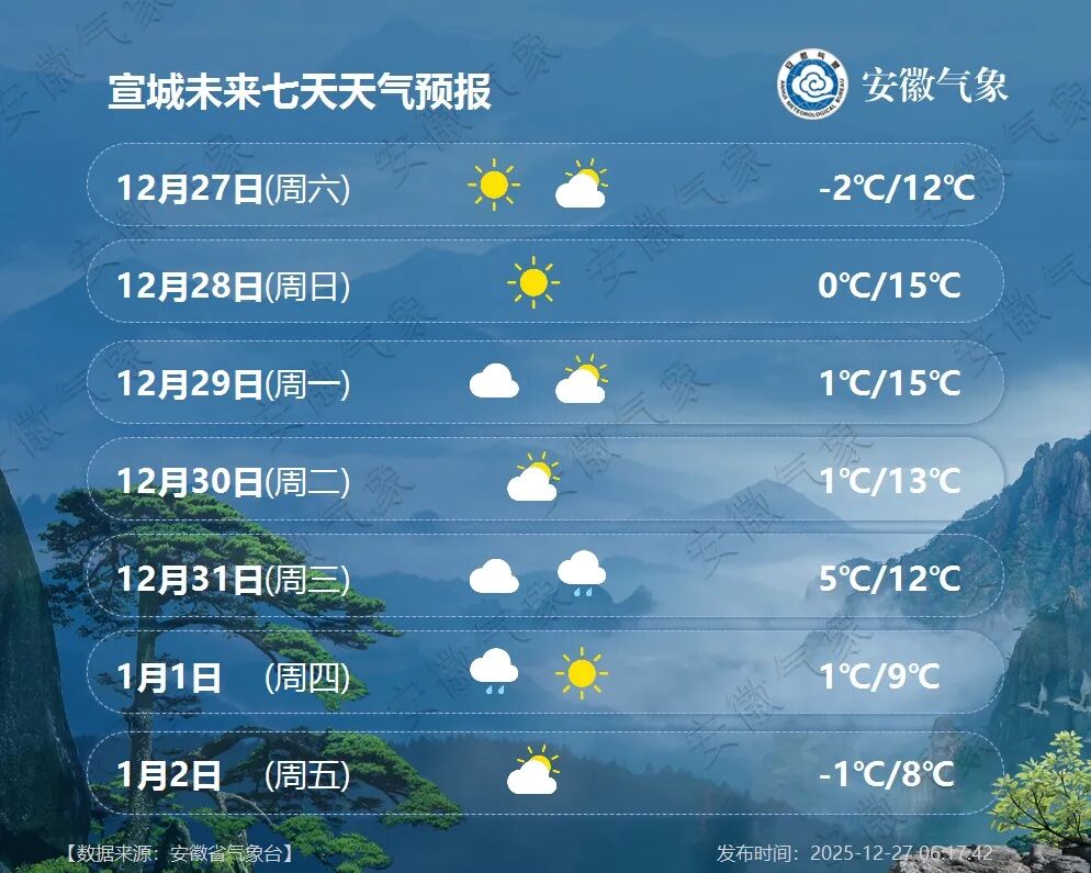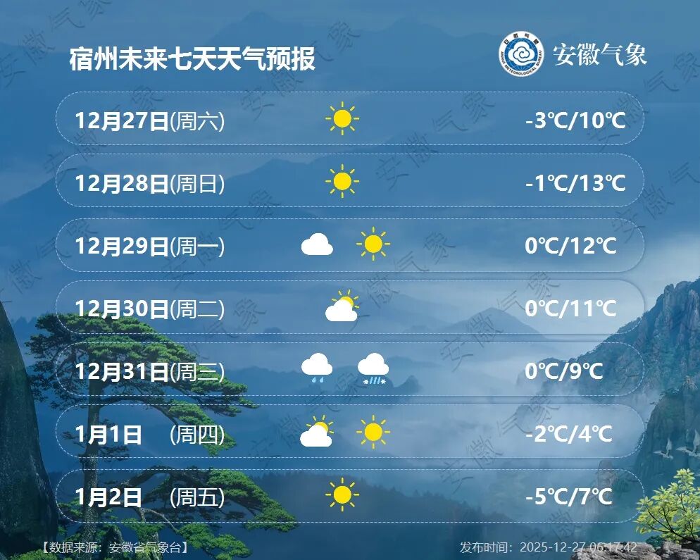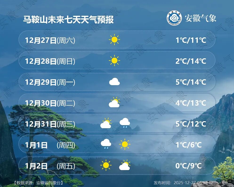 2026年1月1日(周四):全省阴天有小雨,其中沿淮淮北和本省山区有雨夹雪或雪。
