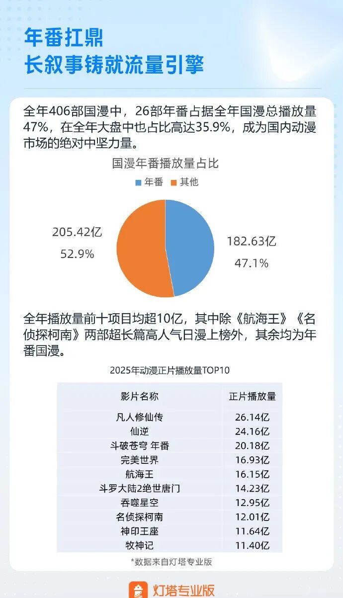 全年406部国漫中,26部年番以“长叙事”突围,贡献了47%的总播放量。而在年度播放量TOP10榜单中,《凡人修仙传》以26.14亿播放量登顶。
