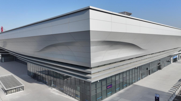 合肥西站以“大湖云帆·科技方舟”为设计主题,外立面融入“巢湖水波、科技脉动”元素,形如扬帆起航的方舟,彰显合肥“大湖名城、创新高地”的城市精神。高架三层铝板飘带总长2400米,全部采用工厂预制、现场单元挂接安装方式,实现三维调节与毫米级拼缝控制。檐口“大眼睛”转角由160块全异形扭曲铝板密拼而成,依托BIM精确建模与离缝拼接技术,将复杂曲面一比一还原,呈现极具张力的视觉焦点。