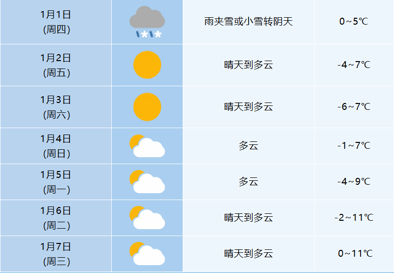 (二)天气情况。据中国天气网预报,元旦假期我市雨夹雪转晴天,气温-6—7℃,路面易结冰。