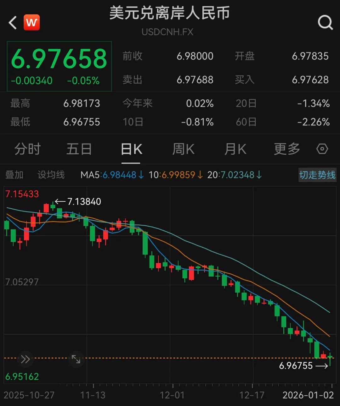 今天(1月2日),离岸人民币对美元一度升破6.97,最高升至6.9678,创2023年5月以来新高。