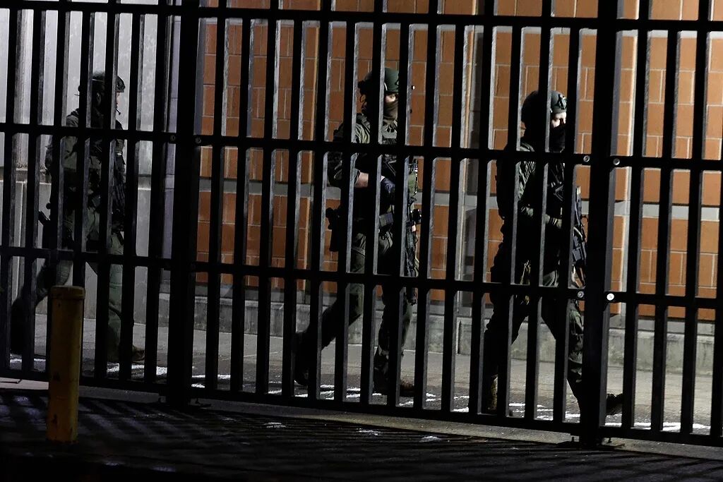当地时间2026年1月3日,美国纽约,全副武装的警察抵达纽约布鲁克林大都会拘留所,委内瑞拉前总统尼古拉斯·马杜罗预计将被关押在此。