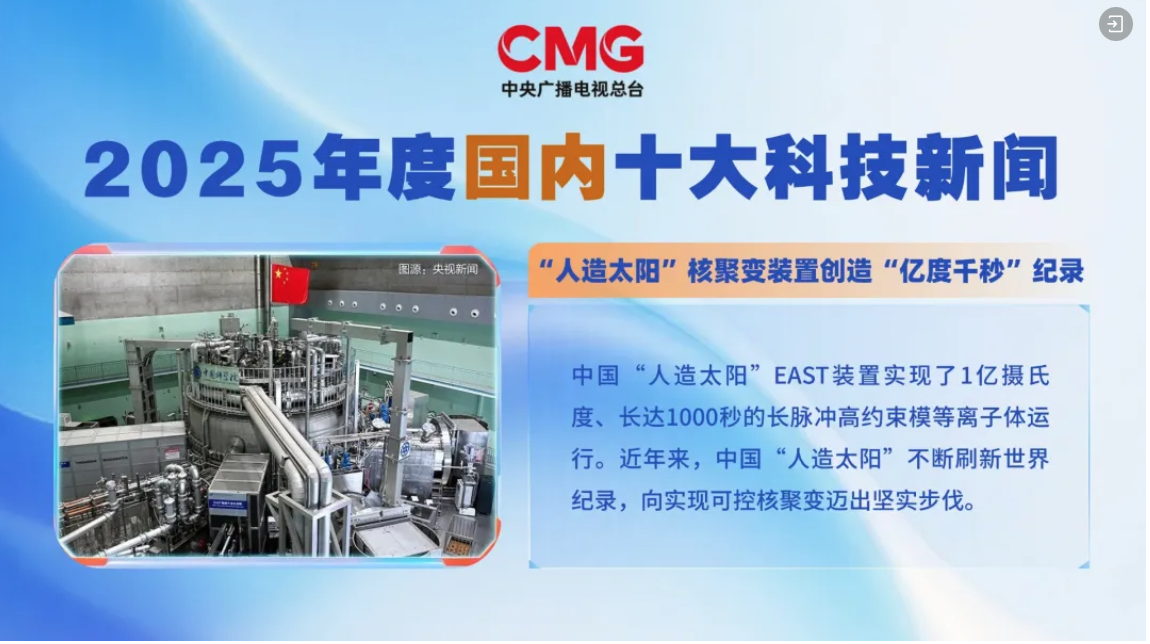 “人造太阳”核聚变装置创造“亿度千秒”纪录入选2025年度国内十大科技新闻。