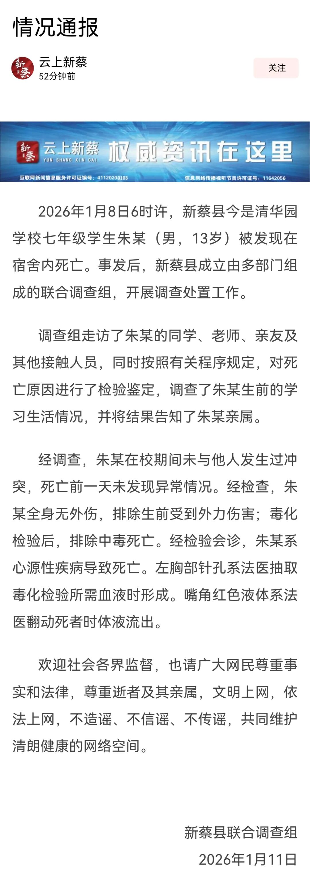 2026年1月8日6时许,新蔡县今是清华园学校七年级学生朱某(男,13岁)被发现在宿舍内死亡。事发后,新蔡县成立由多部门组成的联合调查组,开展调查处置工作。