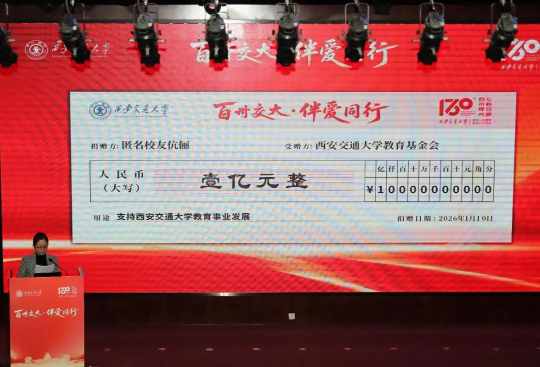 1月10日,西安交通大学“百卅交大·伴爱同行”捐赠仪式在兴庆校区举行。其中,西安交通大学校友伉俪,匿名慷慨捐赠1亿元。