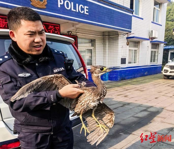 ▲民警对受伤海南鳽初步照料后,移交当地林业部门
