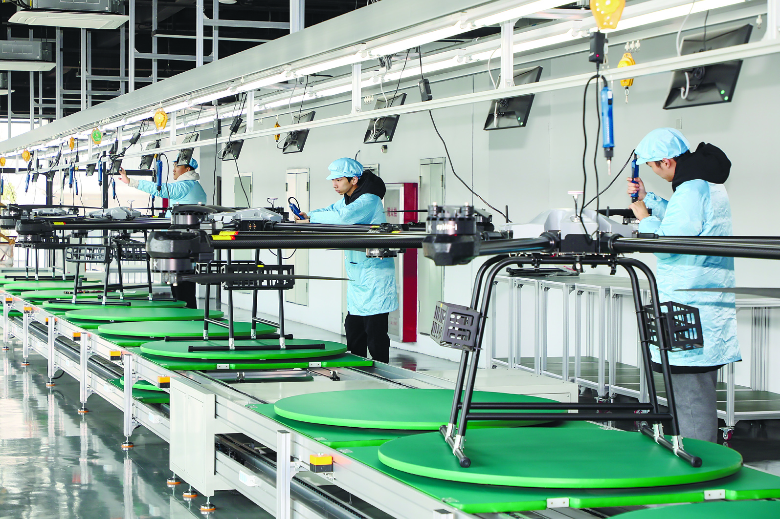 1月15日,在安徽泓景无人机科技有限公司生产加工中心内,技术人员正使用专业设备对多旋翼大载重长航时无人机进行总装与调试。
