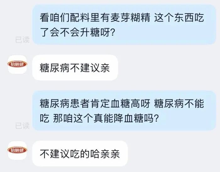 记者又询问了“倍膳健”品牌人参苦瓜荞麦桑叶片的客服“配料表里有麦芽糊精,吃了会不会升糖”,客服表示糖尿病不建议吃。