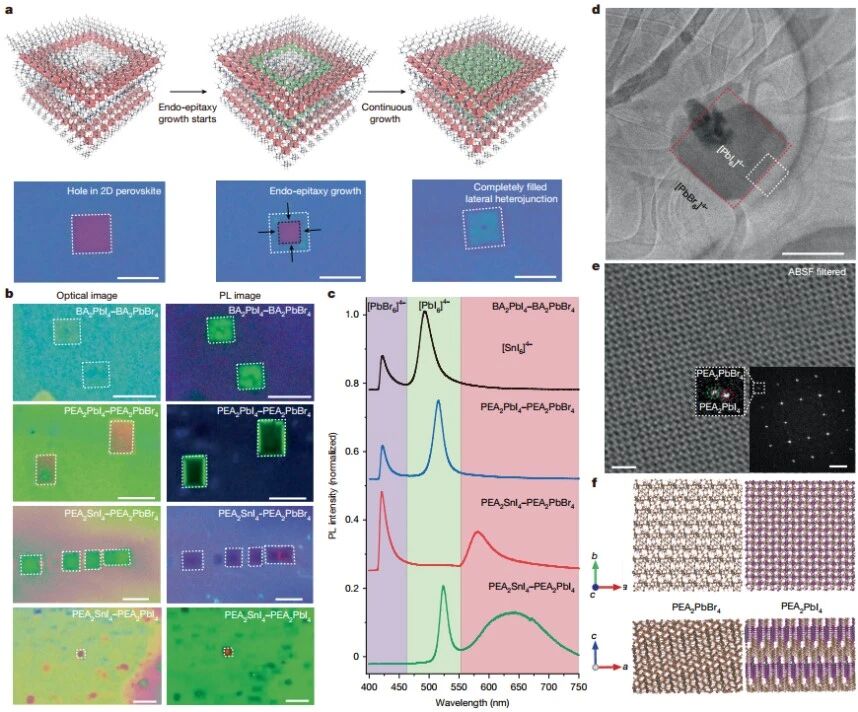 以二维卤化物钙钛矿为代表的离子型软晶格半导体,其晶体结构柔软且不稳定。这一特性使得传统光刻加工等技术难以实现高质量的横向异质集成。