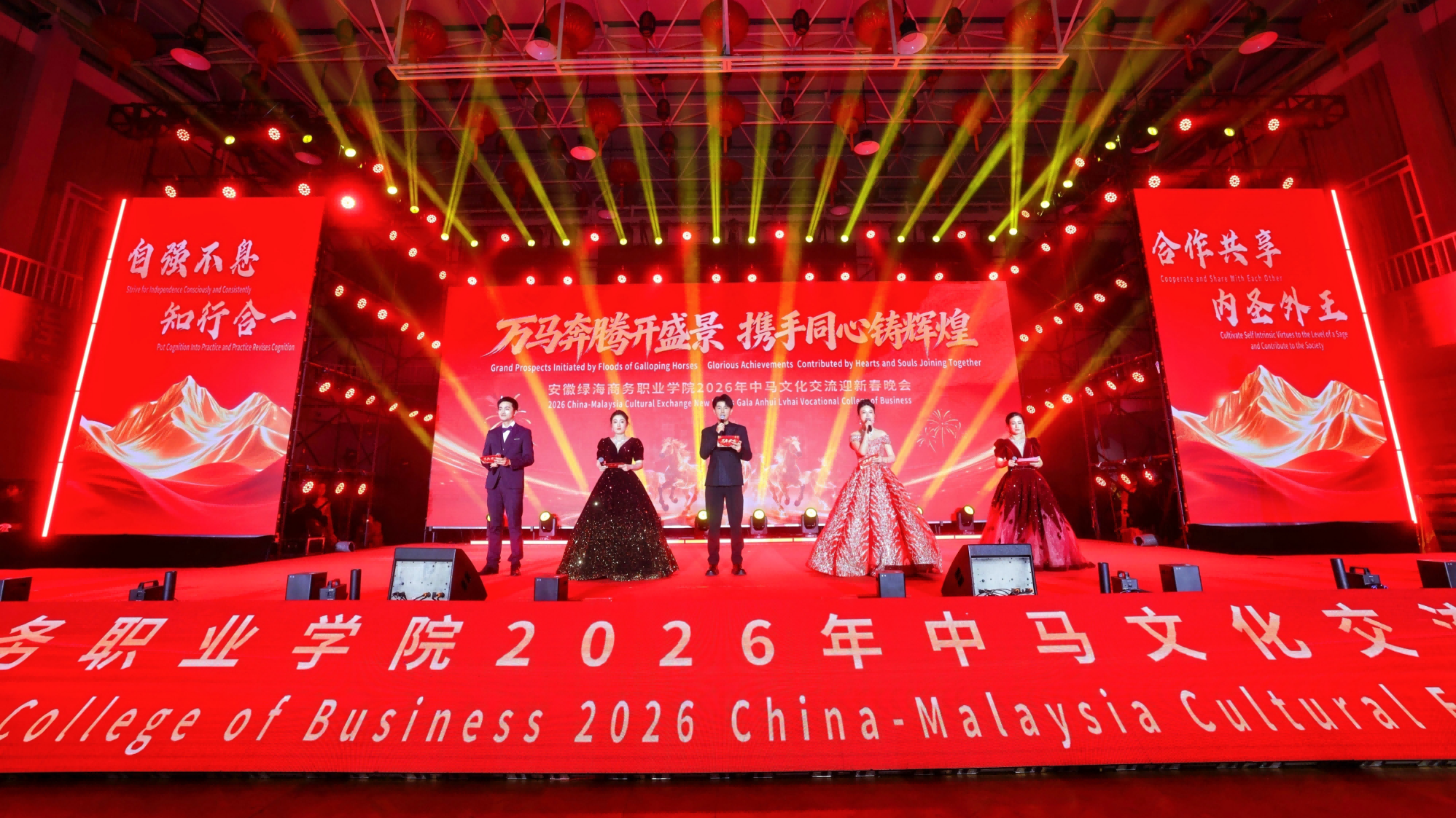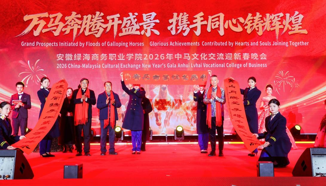 中安在线、中安新闻客户端讯 万马奔腾开盛景,携手同心铸辉煌。日前,安徽绿海商务职业学院大学生活动中心灯光璀璨、掌声雷动,由安徽绿海商务职业学院(简称绿海学院)与姊妹校马来西亚吉隆坡科技大学(简称吉科大)共同举办的“中马文化交流迎新春晚会”举行,为来自国内外的嘉宾及两校师生呈现了一场融汇中马文化、展现时代气息的文化视听盛宴。