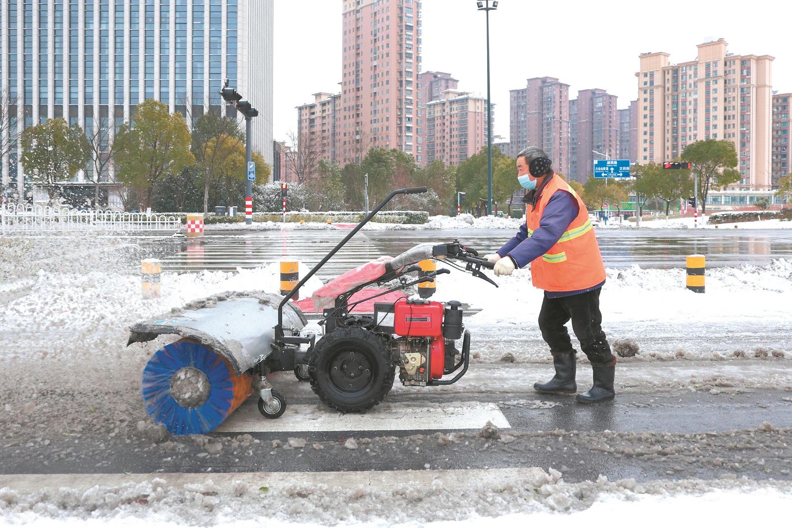 1月20日,在六安各地,工作人员忙着清除积雪,确保道路通畅。记者 王珂 摄