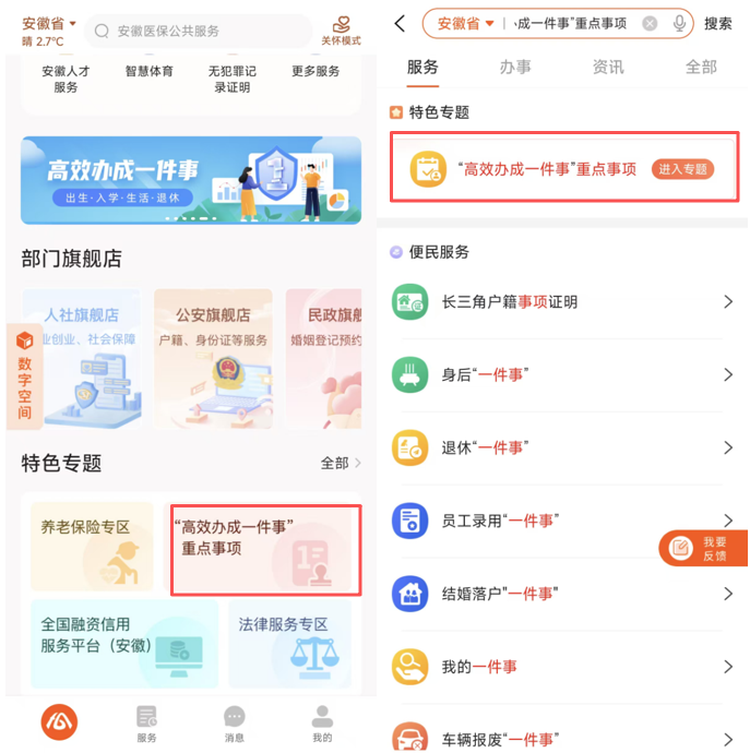1.登录“皖事通”APP,在首页搜索或在特色专题中选择“‘高效办成一件事’重点事项”,点击进入。