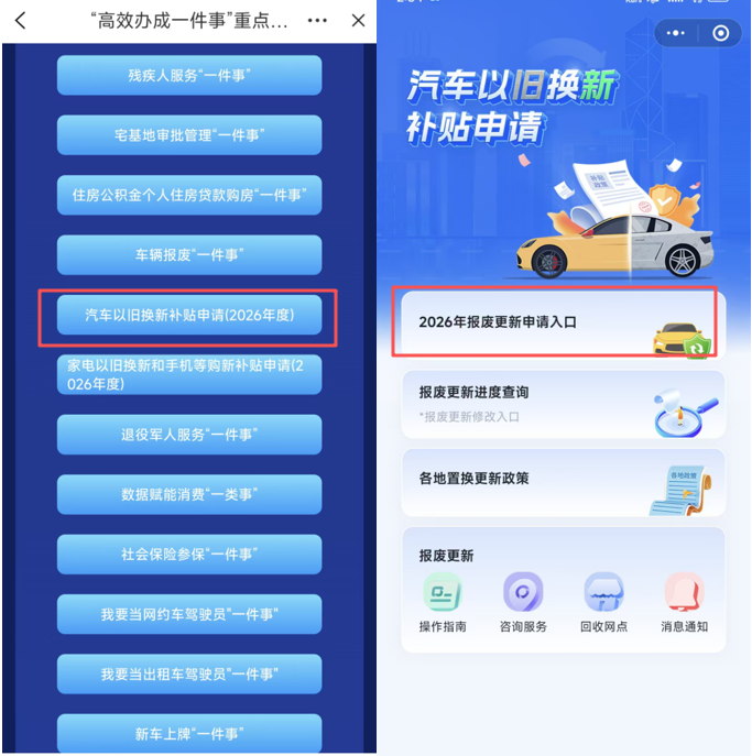2.进入服务页面后找到“汽车以旧换新补贴申请(2026年度)”,进入服务后,选择“2026年报废更新申请入口”进入。