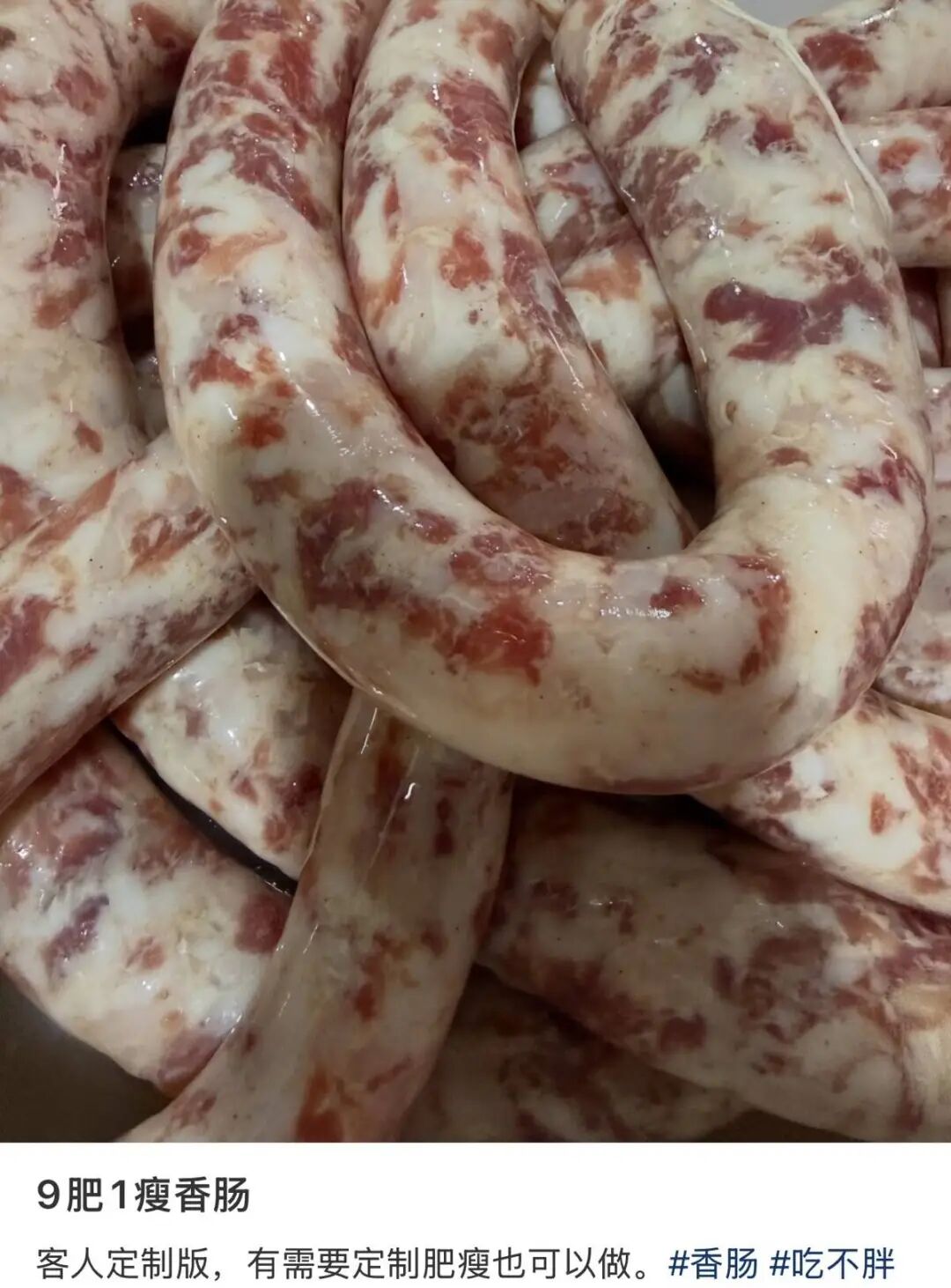 此外,记者在社交平台发现,一位安徽网友发布了香肠定制广告,标明可接受“九肥一瘦”规格的订单,并称“有需要定制肥瘦比例也可以制作”。下方有网友评论“这我喜欢吃”。记者咨询得知,该款香肠为定制款,需15至20天才能发货,“太肥了,吃的人少,有人订我才会灌”。