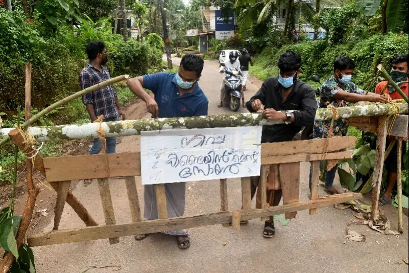 2023年9月13日,在印度南部喀拉拉邦科泽科德地区,人们设置路障以遏制尼帕病毒传播。 孟加拉国、印度、马来西亚等几个国家几乎每年都会发现少量病例。新华社发
