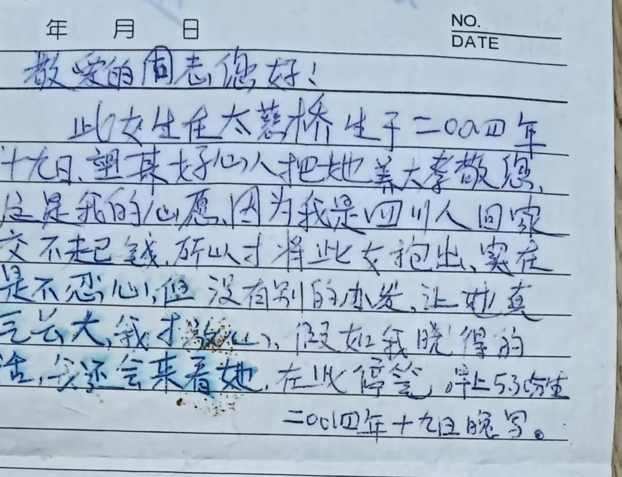 据红星新闻此前报道,目前,周和瑶寻亲的唯一线索,便是当年养父母家捡到她时,襁褓中留下的一张字条。字条内容为:“此女生在太慈桥,生于2004年(月份未写)十九日,望某好心人把她养大孝敬您,这是我的心愿。因为我是四川人,回家交不起钱,所以才将此女抱出,实在是不忍心,但没有别的办发(法),让她真(争)气长大,我才放心。假如我晓得的话,我还会来看她。在此停笔,早上5:30生。”