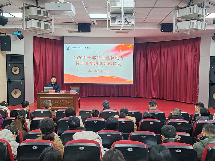 为深入学习贯彻党的二十大和二十届历次全会精神,切实提升学校干部职工队伍的履职能力和综合素养,进一步增强教职工的责任担当意识与服务效能,安徽中澳科技职业学院于1月28日至30日成功举办了2026年干部职工履职能力提升专题培训班。学校党委副书记、校长王德润出席开班典礼并作动员讲话,全体教职工参加了此次培训。