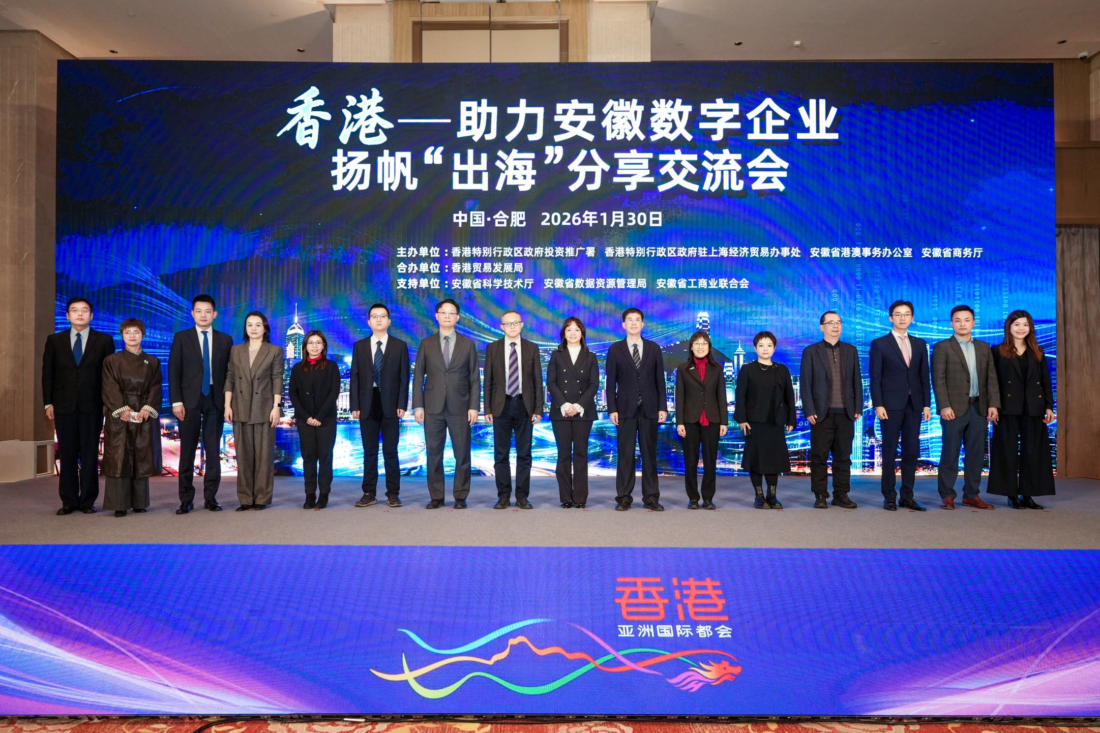 中安在线、中安新闻客户端讯 1月30日,由香港特别行政区政府投资推广署、香港特别行政区政府驻上海经济贸易办事处、安徽省港澳事务办公室和安徽省商务厅共同主办的“香港-助力安徽数字企业扬帆‘出海’分享交流会”在合肥成功举办。活动聚焦香港营商优势、资本市场趋势及数字科技领域发展机遇,旨在深化皖港经贸合作,支持安徽新质生产力企业以香港为起点实现高质量“出海”。