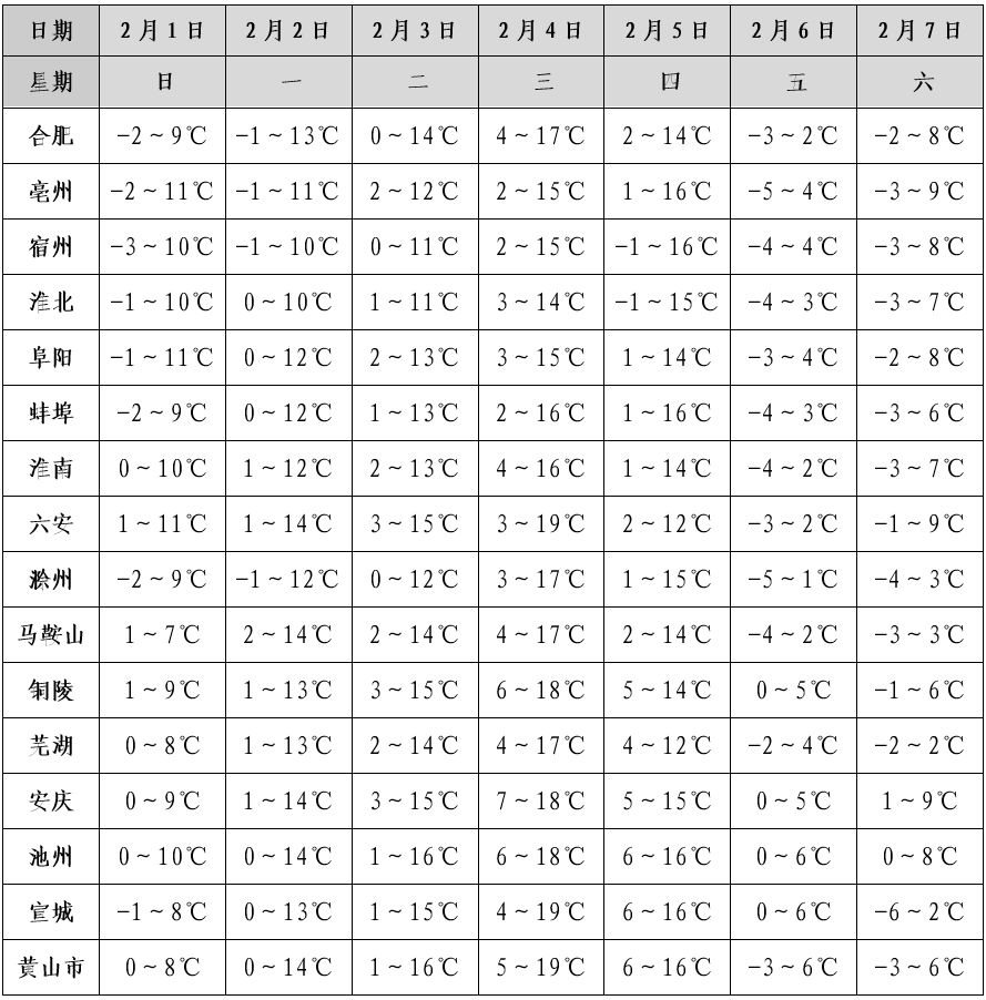 合肥市5-6日和9日分别有一次降水过程,其他时间以多云到晴天气为主。4日前气温逐步回升,最高气温18℃左右;5-6日受冷空气影响,平均气温将下降5~7℃,7日早晨最低气温-2℃左右。