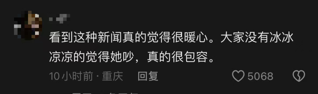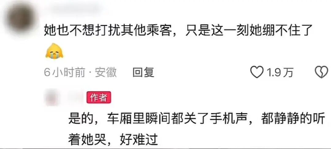 这一幕,被乘客拍下后发到社交平台,网友们纷纷共情,”她也不想打扰大家,这一刻她绷不住了”;也有网友称自己也曾经与视频中的女子有过同样的经历;车厢中乘客的安静陪伴让网友觉得“暖心”。
