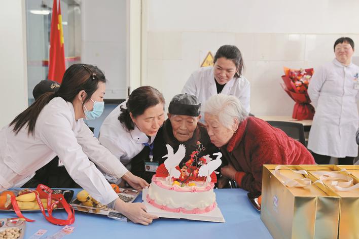 1月20日,在淮北市惠康医养中心,党员志愿者正在为这里的百岁老人庆祝寿辰。该中心深化党建与养老服务融合,推动服务提质增效,以“党建红”守护“夕阳红”,切实提升老年人幸福感与归属感。