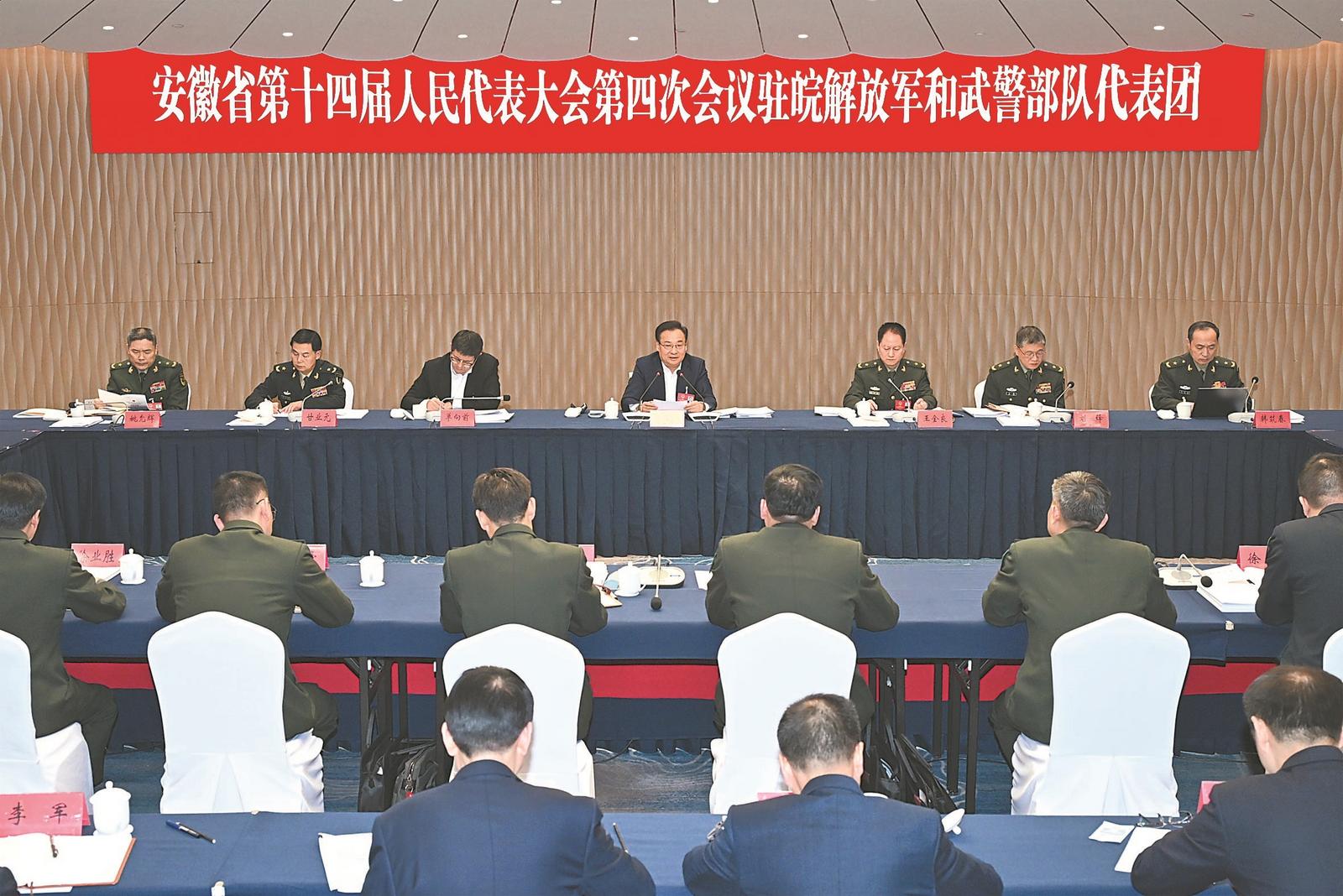 2月5日下午,省委书记梁言顺来到驻皖解放军和武警部队代表团,与代表们一起审议政府工作报告、审查“十五五”规划纲要草案。安徽日报记者 杨竹 许昊 摄