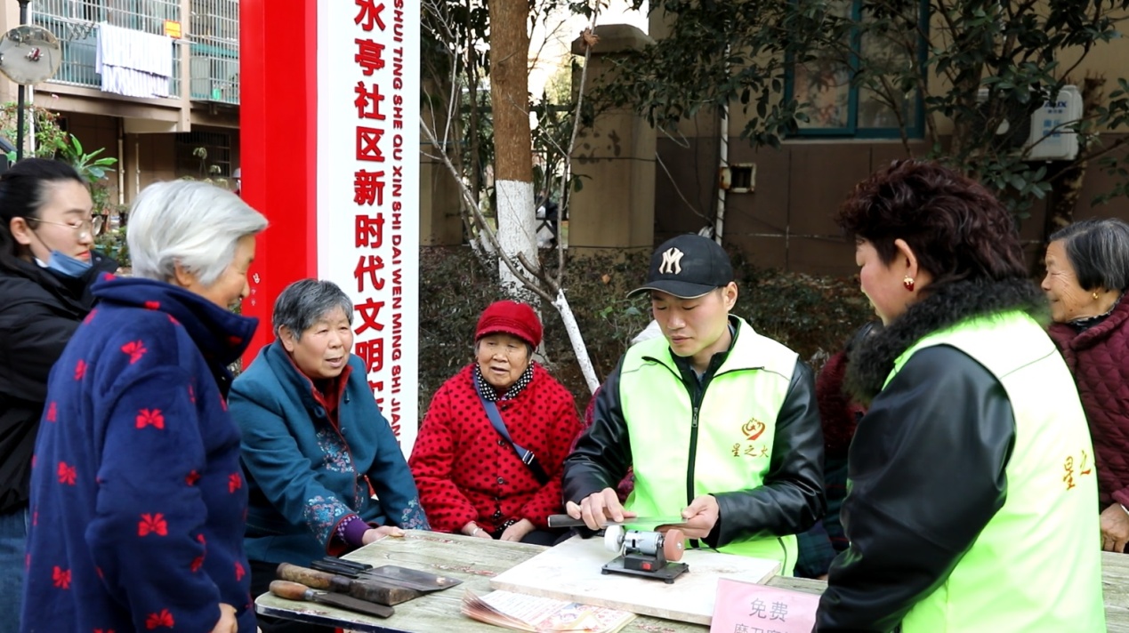 当天上午,秀水亭社区院内暖意融融。这边,医务人员正耐心为老人测量血压、讲解健康知识;那边,书法爱好者挥毫泼墨,一副副红彤彤的“福”字映衬着笑脸;便民服务台前,老师傅手中的菜刀磨得锃亮,一旁的安全宣传、法律咨询、文明养犬倡议等服务也围满了人。