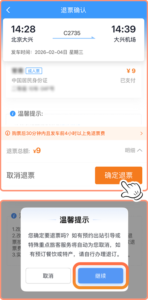 旅客通过铁路12306平台(含网站、App、支付宝小程序),使用电子支付或积分支付购票时,如误购车票,同时满足以下2个条件,即可自行线上免费办理退票。
