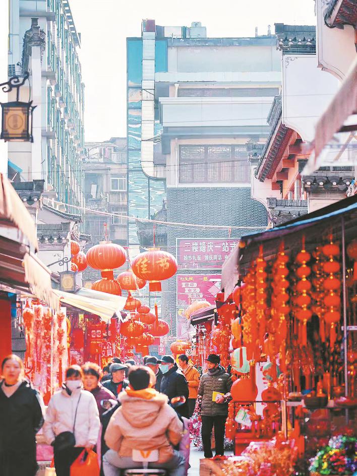 对联铺频频补货,炒货日营业额刷新。灯笼与老城街巷成了不少人镜头里氛围感满满的“出片地”。