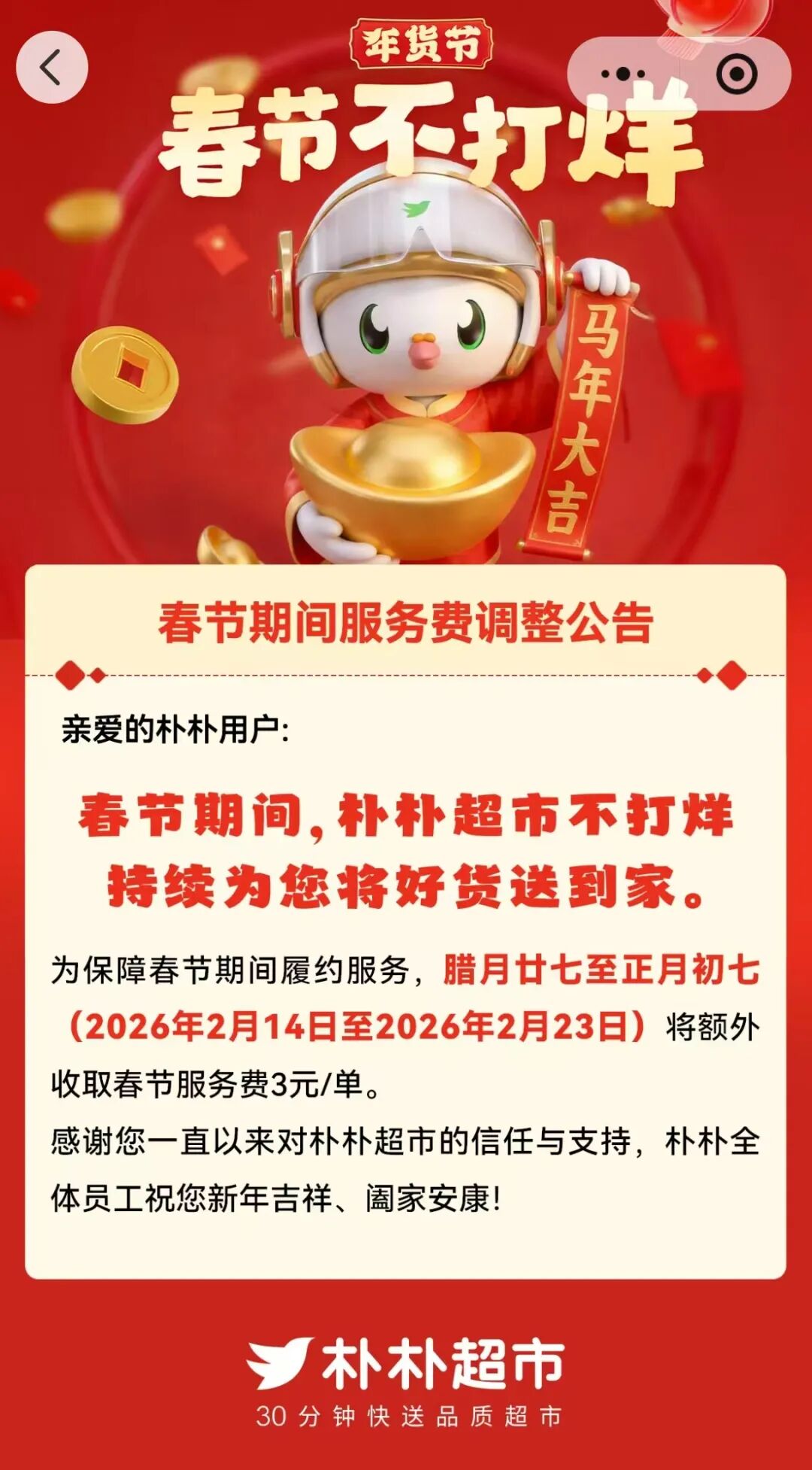 朴朴超市表示,为保障春节期间履约服务,腊月廿七到正月初七(2026年2月14日至2026年2月23日),朴朴将额外收取春节服务费3元/单。