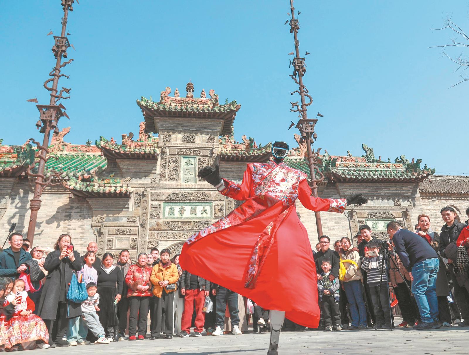 2月20日,机器人在亳州市谯城区花戏楼景区表演舞蹈和武术。通讯员 程伟如 摄