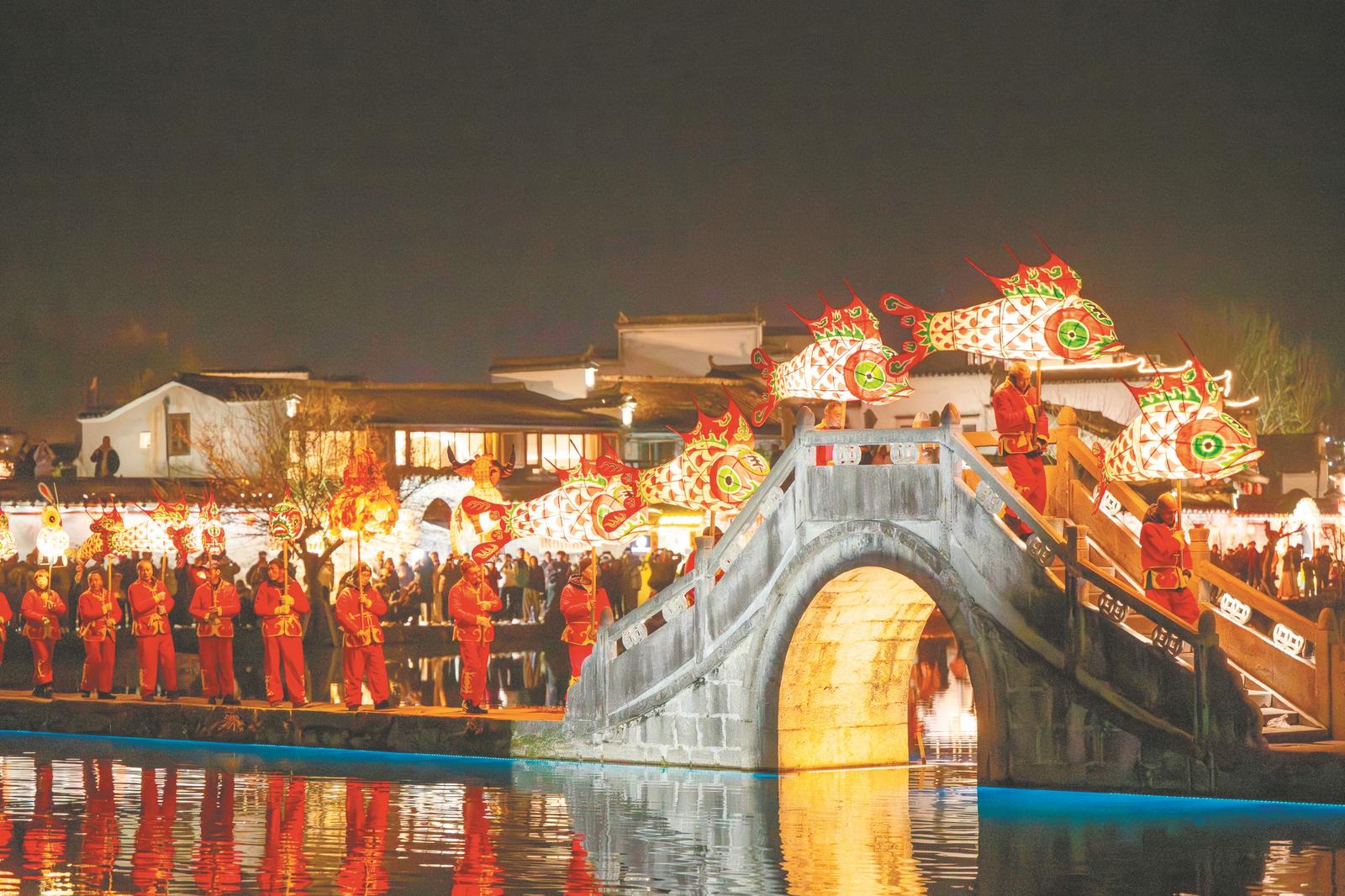 2月17日,大年初一,黟县宏村景区,一场融合传统非遗与现代光影的鱼灯巡演精彩上演。通讯员 赵明 摄