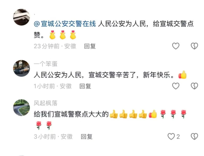 “宣城公安交警,为人民服务”群众将这条视频发布后,众多网友点赞留言。