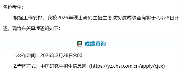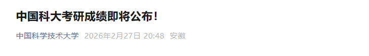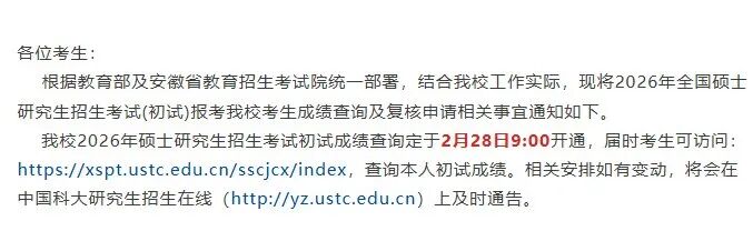 中国科学技术大学2026年硕士研究生招生考试初试成绩查询定于2月28日9:00开通。