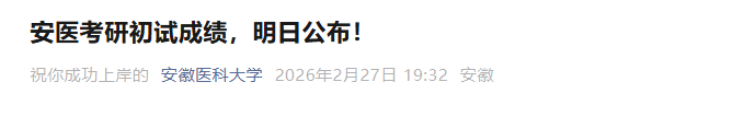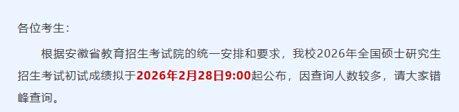 安徽医科大学2026年全国硕士研究生招生考试初试成绩拟于2026年2月28日9:00起公布,因查询人数较多,请大家错峰查询。
