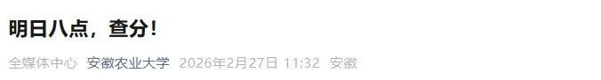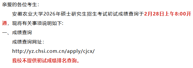 安徽农业大学2026年硕士研究生招生考试初试成绩查询于2月28日上午8:00开通。