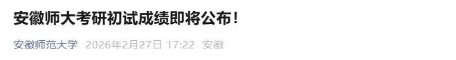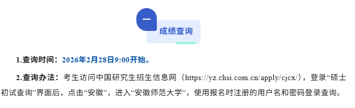 安徽师范大学2026年硕士研究生招生考试初试成绩查询将于2026年2月28日9:00开通。
