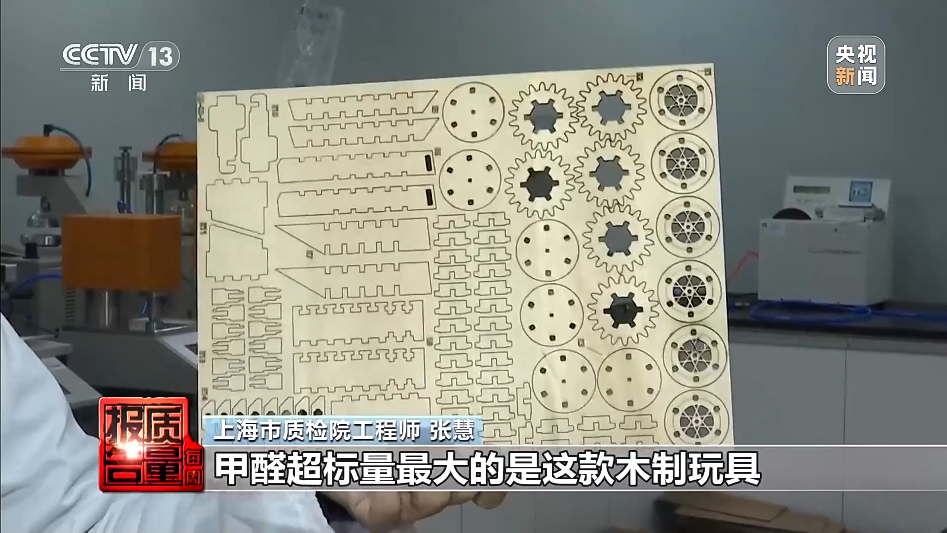 上海市质检院工程师 张慧:中国玩协一共送样66批次,有9批次不符合新国标的要求。甲醛超标量最大的是这款木质玩具,超限量值33倍多。一款电动毛绒玩具TVOC释放量是很高的,超新国标限量值大概7倍多。