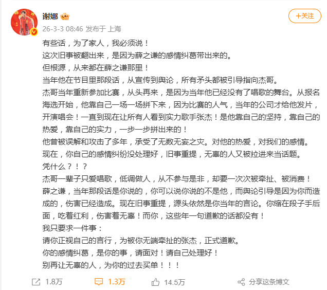3月3日,谢娜为张杰发声,喊话薛之谦道歉,直言这次旧事被翻出来,是因为薛之谦的感情纠葛带出来的。但根源,从来都在薛之谦那里,当年他在节目里那段话,从宣传到舆论,所有矛头都被引导指向张杰。