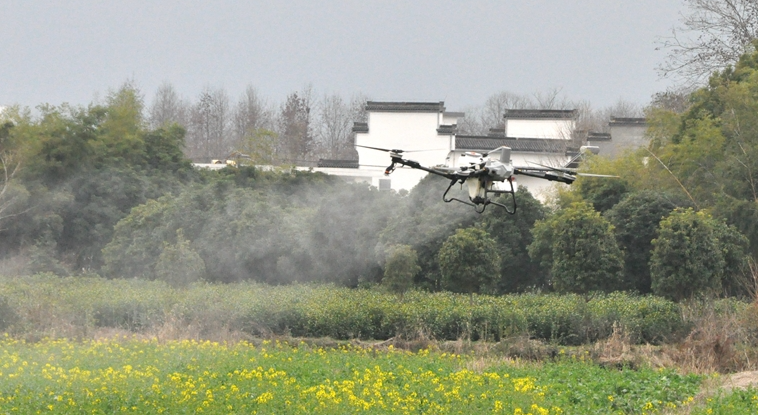 3月3日,黟县碧阳镇农民利用无人机飞防作业,管控油菜花田,通过精准补肥与施药,确保油菜稳产增收。朱光明/摄