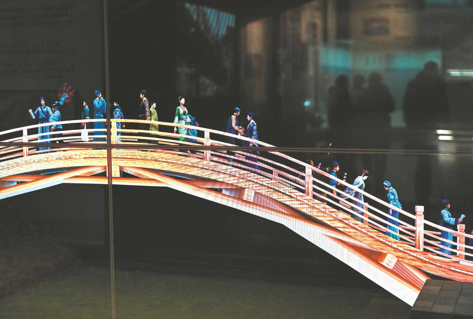 画卷中心的一座桥,抢眼!桥面上,马匹和轿子迎面相遇;桥拱下,客船与货船狭路相逢。这座桥名为虹桥,故事抵达高潮,虹桥成为“画眼”。“其桥无柱”“宛如飞虹”,典籍中的描述,让我们知晓:依靠木料咬合承载车马行人,在当时世界桥梁中也是独树一帜。