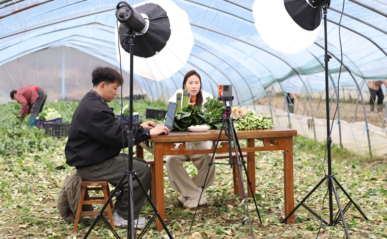 3月5日,在位于祁门县祁山镇芳村村的新冈家庭农场内正在进行一场直播活动,主播团队将直播间直接搬进温室大棚,对着镜头详细介绍菜心、上海青等时令蔬菜,工作人员同步处理后台订单;镜头之外,菜农们忙着采摘、分拣,让新鲜蔬菜从地头直达消费者餐桌。