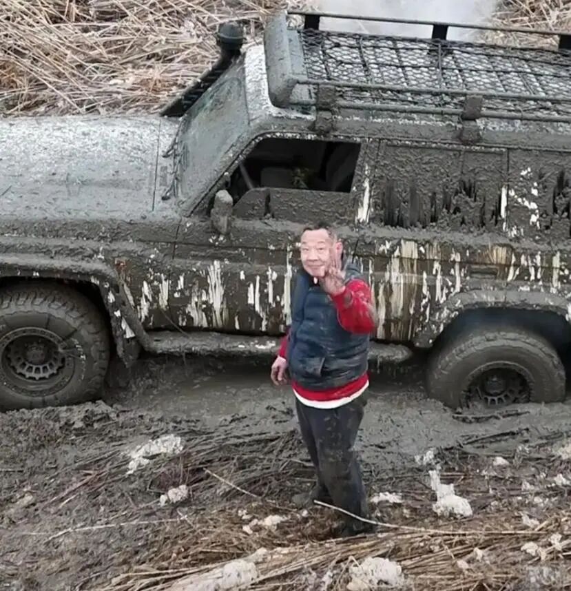 于东来现身河南汝州,开着越野车在汝河附近泥地撒欢(来源:网络)