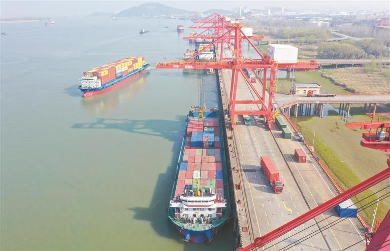 3月10日,芜湖港朱家桥集装箱码头巨轮穿梭、岸桥林立,一派繁忙作业景象。2025年芜湖港集装箱吞吐量达180.51万标箱,稳居全省首位;2026年开年以来,朱家桥码头多次刷新昼夜作业量纪录,最高达6897标箱,正以强劲势头向全年200万标箱目标冲刺。(记者 陈剑 摄)